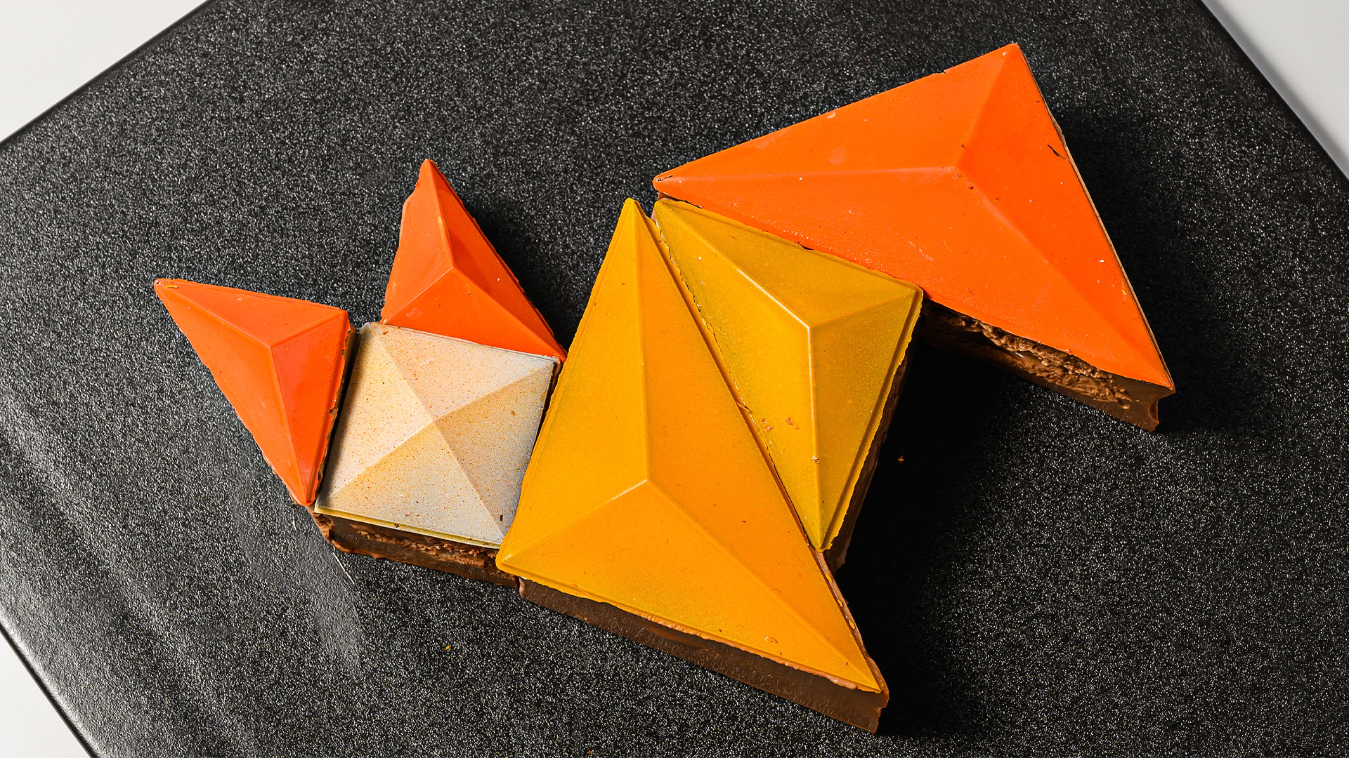 This chocolate cake fostered citrus flavours, first in the shape of a financier prepared with orange peel. For a lower sugar content, the mousse was crafted with dark chocolate and paired with a mandarine and orange jelly for added freshness and texture. A classic touch was added with a vanilla cream paired with orange buttercream that brought all the flavour profiles together. The chef chose dark chocolate to emphasise the tangy character of oranges and mandarines. The softness of the cake, mousse, and jelly ensured an overall smooth and airy experience.