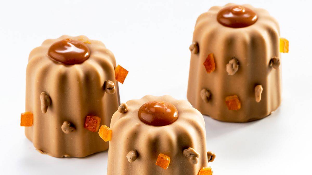 Place the Pépites Cacao Zéphyr™ Caramel and candied orange cubes on the sides of the cannelés.