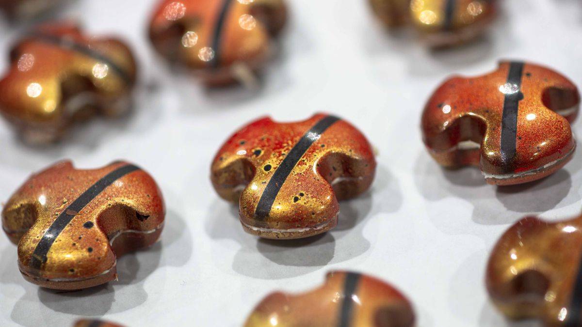 Colour shapes with black splashes. Inject gold, red, black and white. Mould with Cacao Barry - Extra-bitter Guayaquil 64%. Inject three dots of jelly, continue filling with the ganache. Let cool. Seal and place on eachother. Allow to cool and demould.