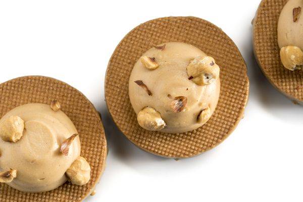 Melt cocoa butter until 55C. Add praline, hazelnut grains and tempering.